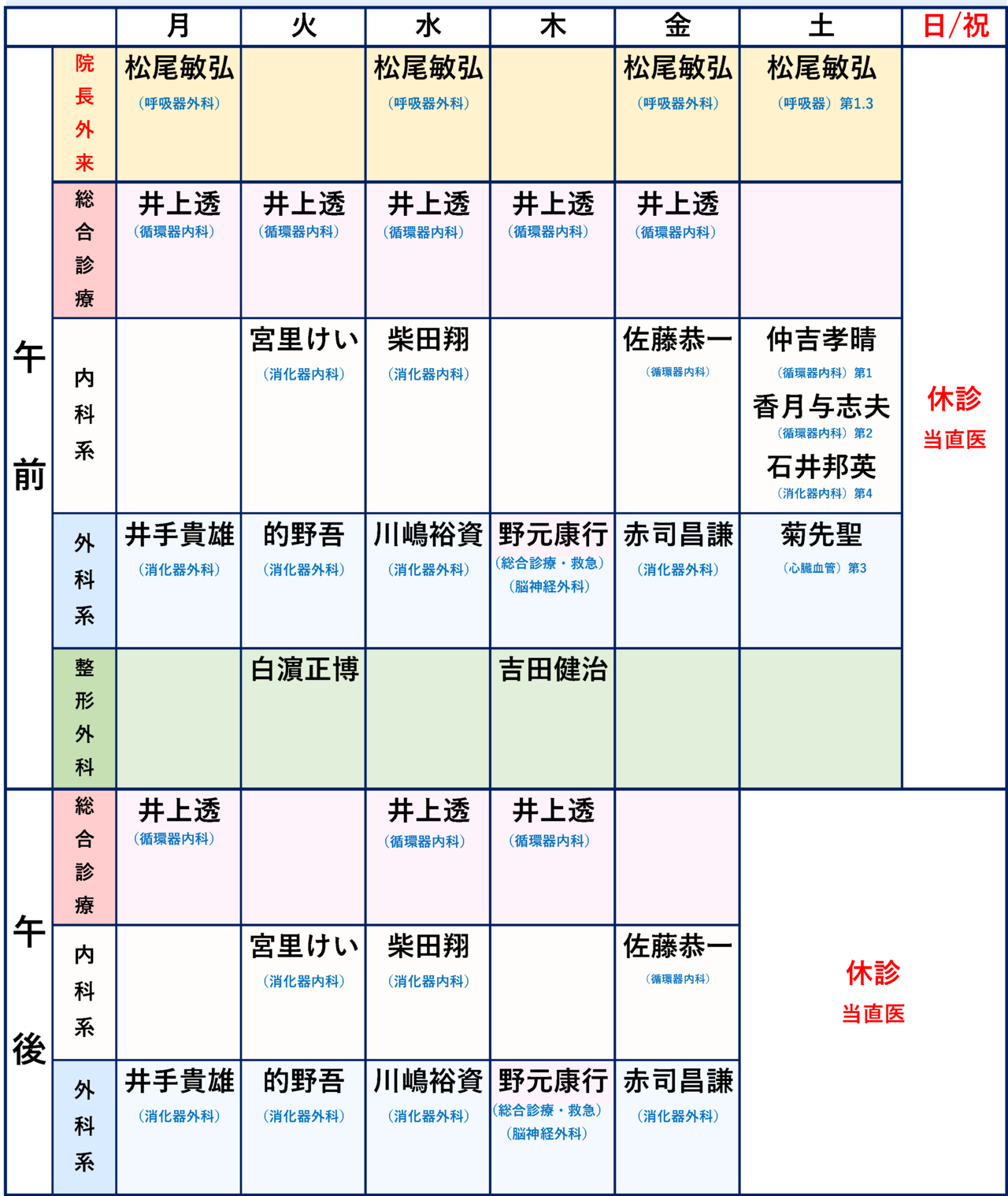 | 循環器内科・総合診療 | 井上 透 | 月曜日~金曜日(火・金は午前のみ) |